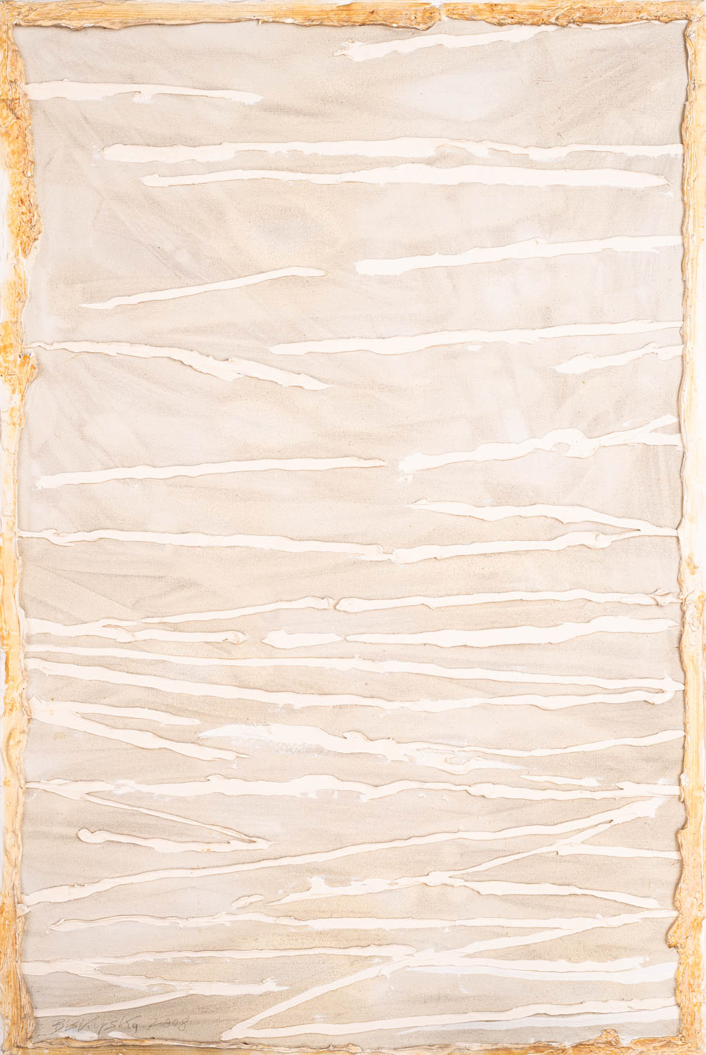 Obraz abstrakcyjny, biało-złocisty z poziomymi liniami