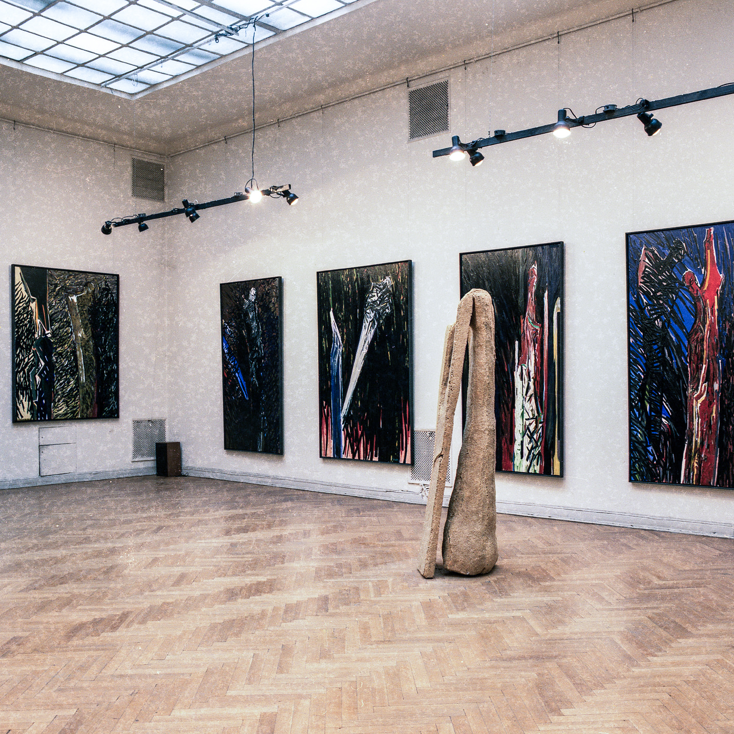 Wystawa Bożenny Biskupskiej -Misterium Czasu, Narodowa Galeria Sztuki - Zachęta, Warszawa, 1986 rok. Obraz z cyklu Non omnis moriar oraz rzeźba z serii Płytowce.
