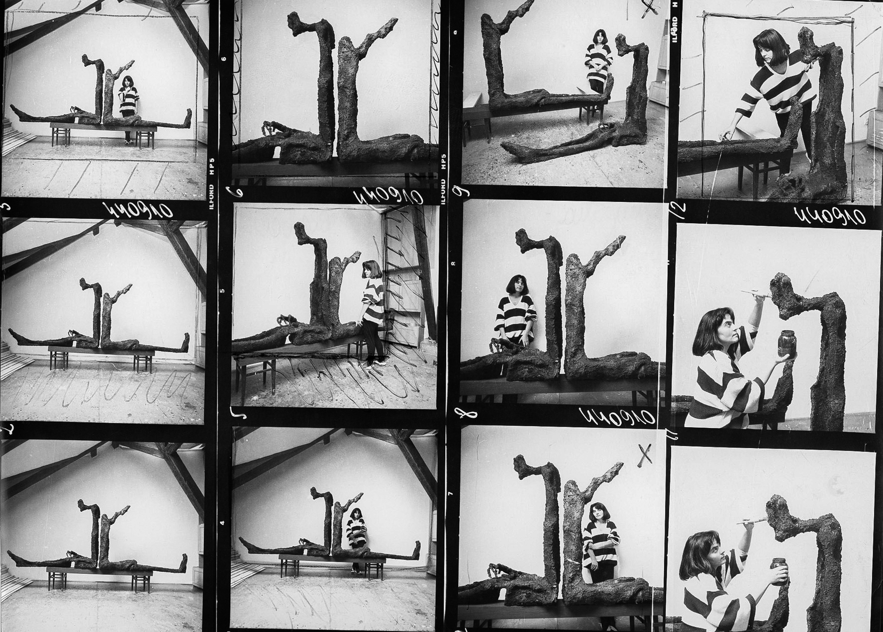 Rzeźby w pracowni artystki przy ulicy Lwowskiej w Warszawie, 1987-1988, fotografia stykowa.